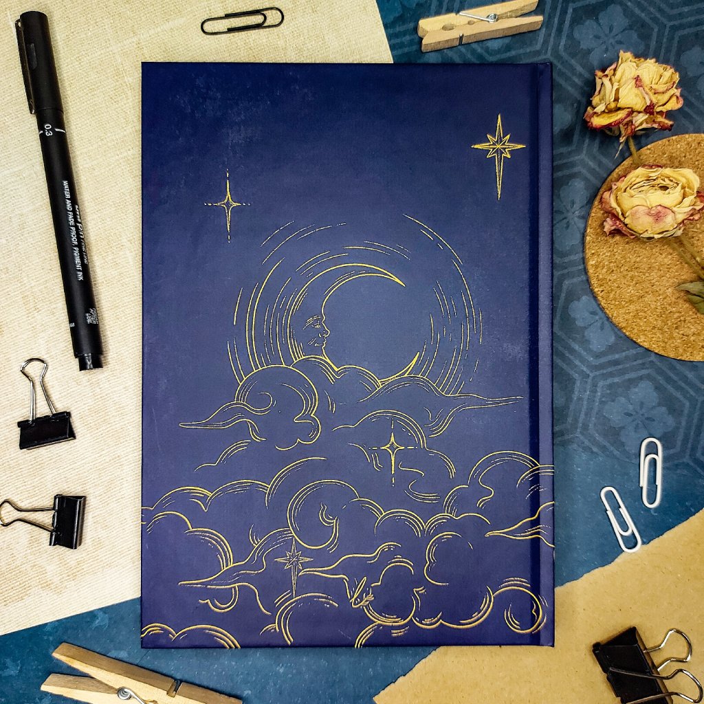 Tmavě modrý podklad doplňuje elegantní zlatá ilustrace slunce, které vykukuje zpoza načechraných oblaků. Jemné linky připomínají noční oblohu plnou hvězd a dodávají diáři kouzelný, snový nádech. Je to obálka, která v sobě spojuje klid, krásu i kousek tajemství – přesně taková, aby vás inspirovala po celý rok.