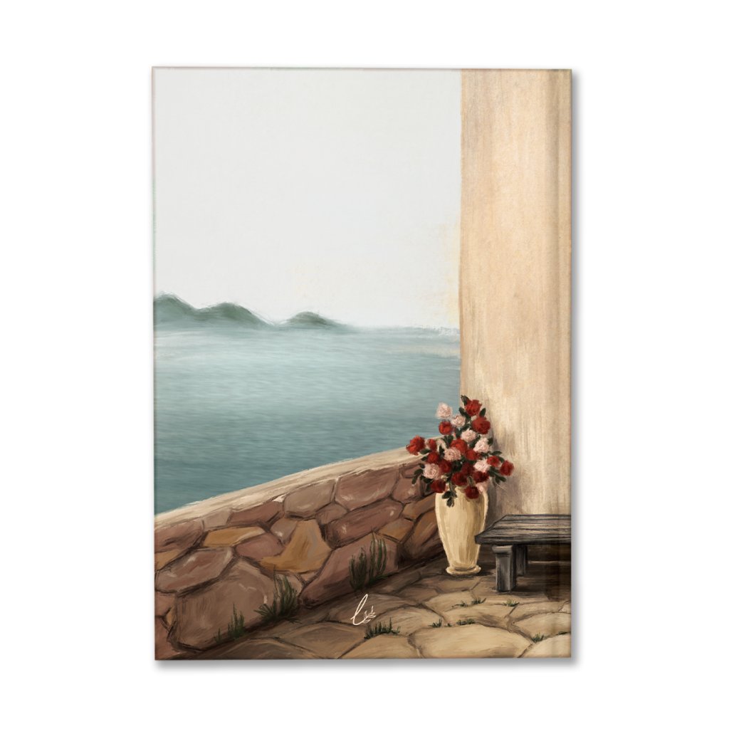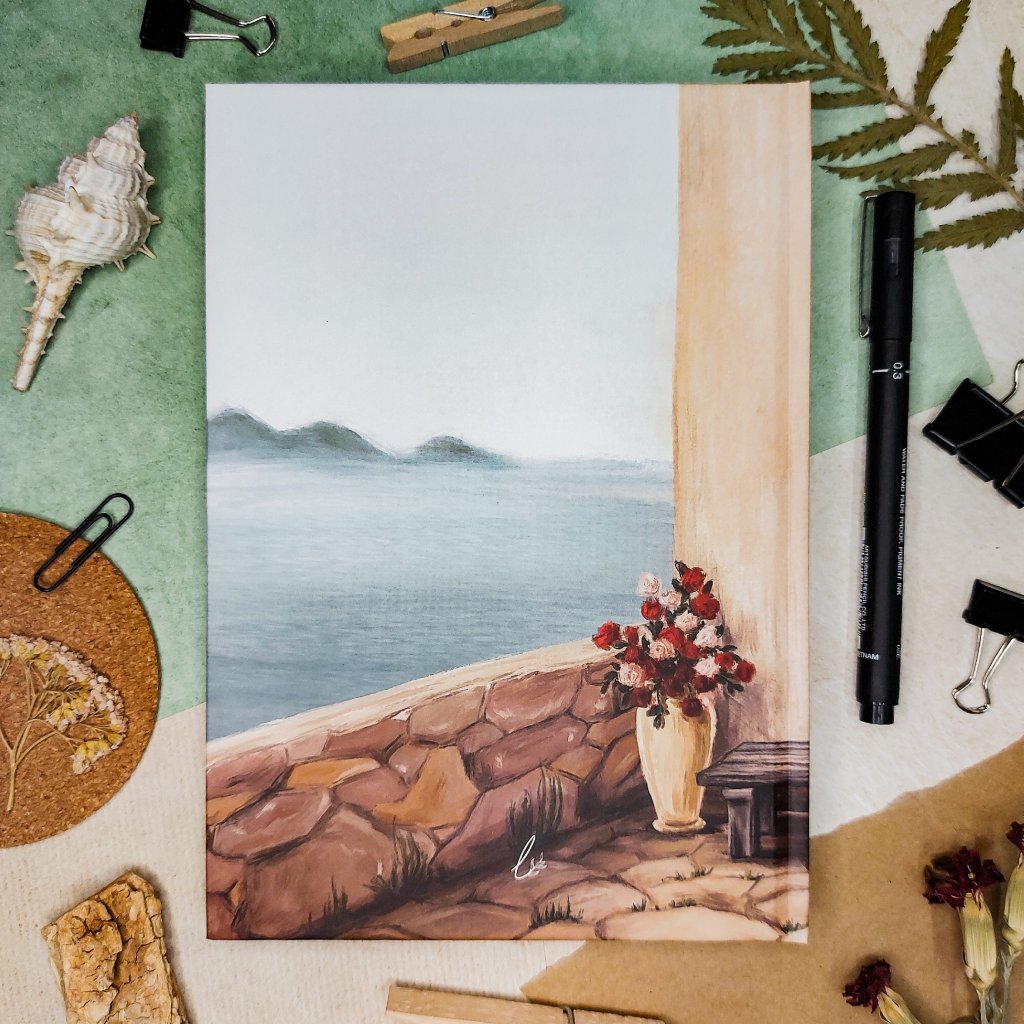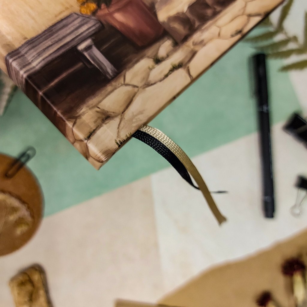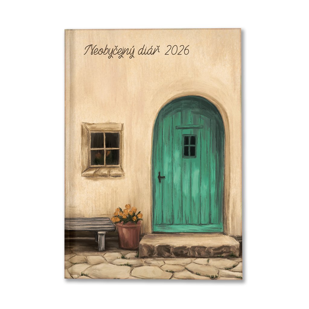 Jemné béžové zdi, dřevěné okno a masivní tyrkysově zelené dveře vytvářejí útulnou atmosféru starého domu, u kterého si člověk rád na chvilku odpočine. Na lavici nebo u květináče s oranžovými kvítky si můžete představit sebe s šálkem kávy, zatímco plánujete svůj den. Obálka působí hřejivě a přívětivě, jako pozvání vstoupit do roku plného příjemných okamžiků.