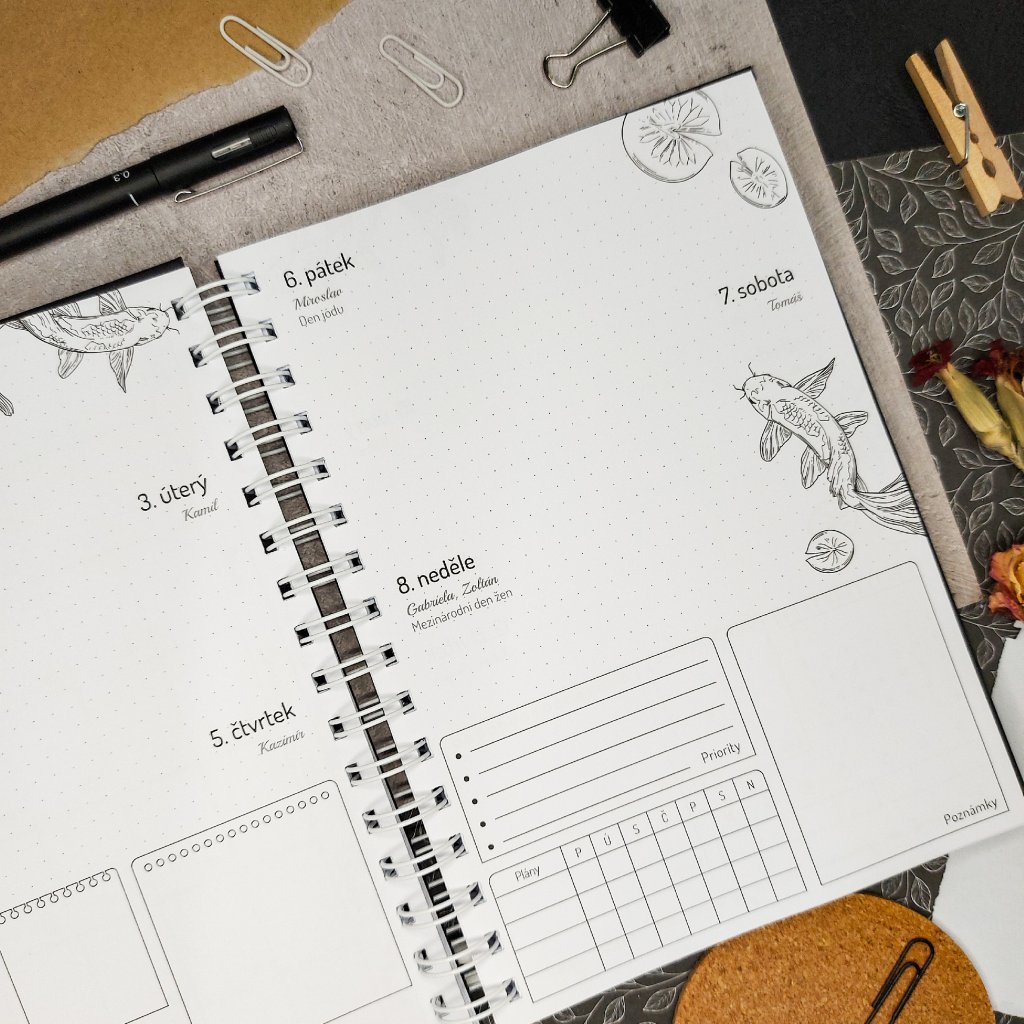 Pokud Vám připadá, že tomu stále něco chybí, máte možnost dokoupit si doplňkové stránky a jednoduše je do svého diáře přidat, kam si zamanete. Pohodlná kroužková vazba dává nepřeberné množství možností a prostor Vaším nápadům.