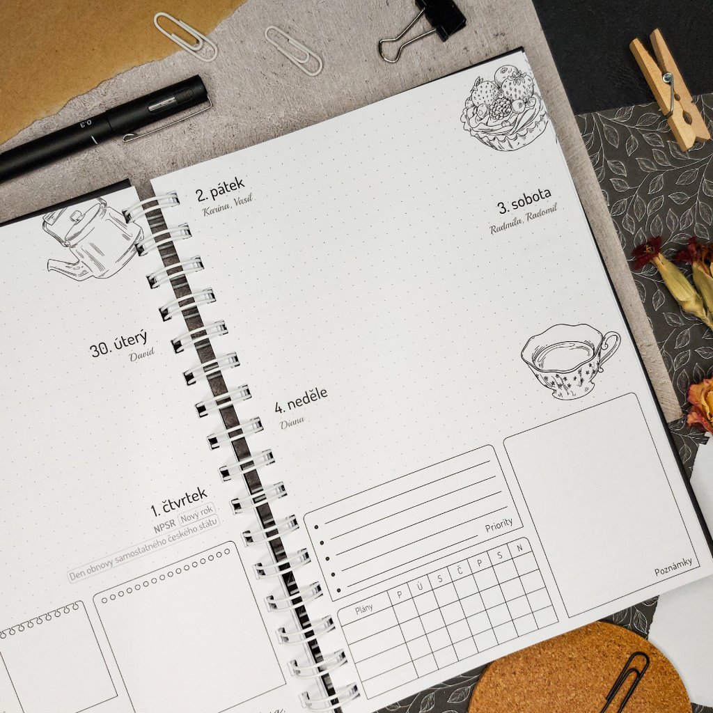 Tečky v našem diáři nabízejí maximální flexibilitu a svobodu – můžete si podle nich snadno vytvořit jak linky, tak čtverečky, nebo je nechat volné a využít prostor přesně podle svých představ. Díky tečkám se nemusíte omezovat, můžete psát a tvořit, jak vám to zrovna vyhovuje.