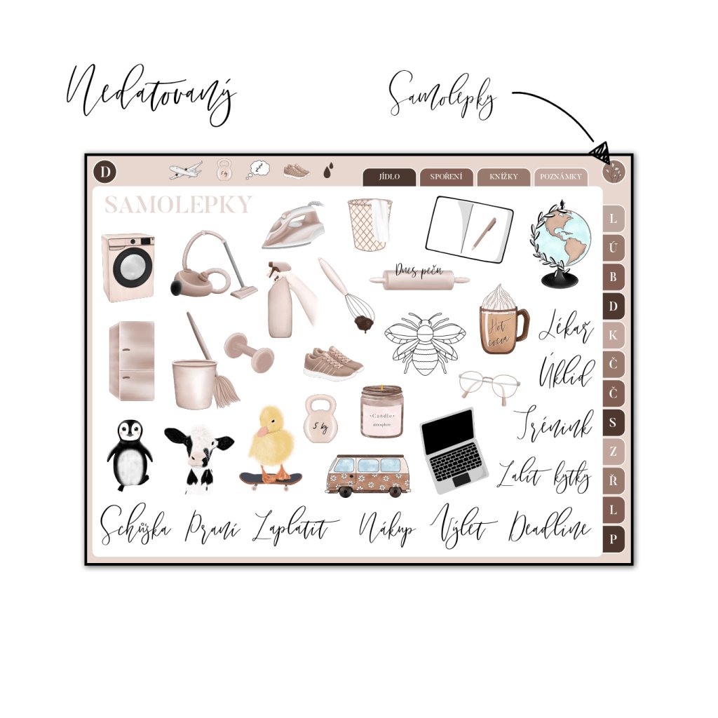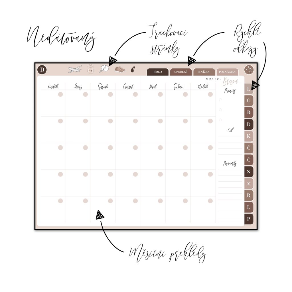 Minimalistický design, který v sobě ukrývá odkazy, díky kterým se snadno pohybujete po souboru. Například z ledna snadno překliknete na trackovací stránky - menstruace, pitný režim, trénink, cestování, běh, počet kroků, samolepky a další (viz fotky).