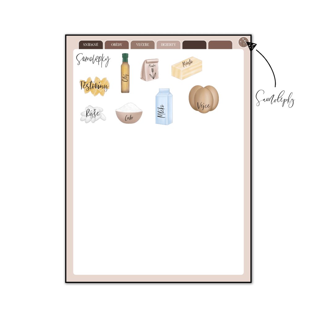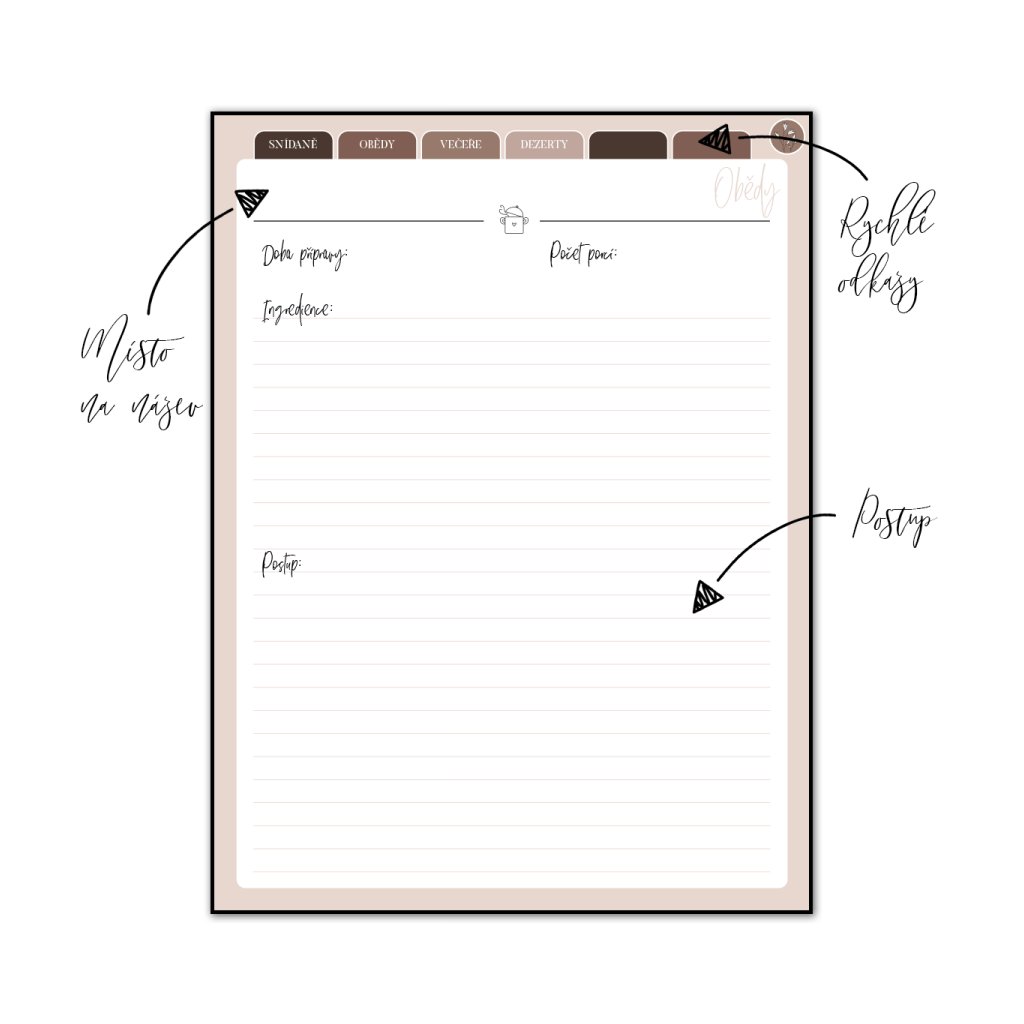 Stránky se dají nakopírovat kolikrát budete potřebovat. Předpřipravené zde jsou snídaně, obědy, večeře a dezerty a dvě prázdná proklikávatelná políčka na vaše další kategorie. :) V souboru je připraveno 25 stránek od každé kategorie, ale můžete přidávat libovolně dle svých potřeb.