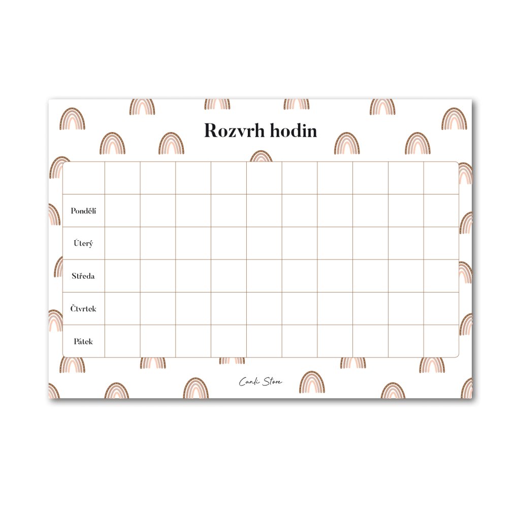 Kdo by ve škole nepotřeboval rozvrh hodin? Připravili jsme pro vás několik druhů školních rozvrhů hodin. Vyberte si z několika barevných designů jako je třeba tento rozvrh hodin duha. Černobílé designy si můžete vybarvit, když budete mít dlouho chvíli. Pro děti na základní škole to bude jistě zábavná činnost a naučí se, že je důležité mít přehled v tom, co je čeká. Nechte děti vyplnit rozvrh hodin dle svého. Spojovat zábavu s povinností to je to čeho se snažíme v Canli Store dosáhnout.