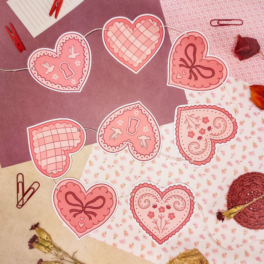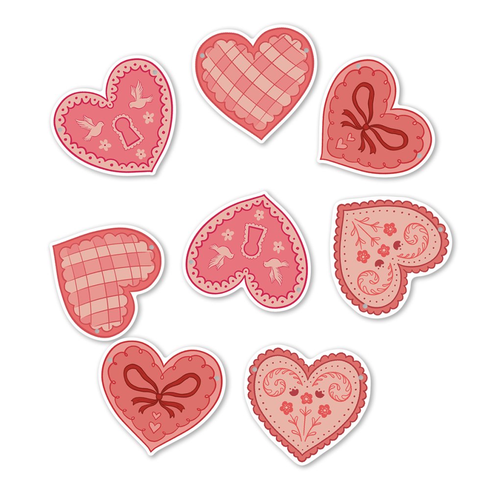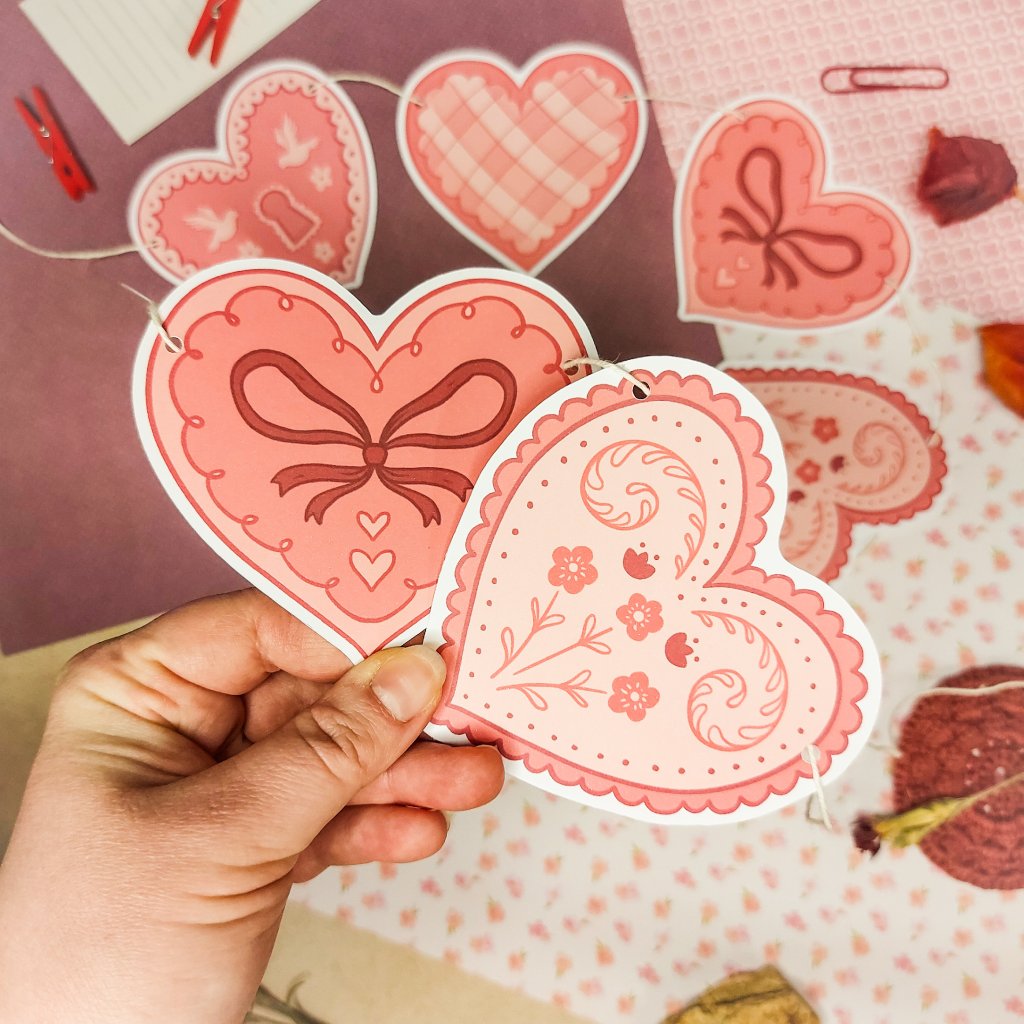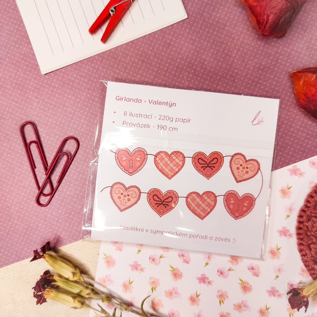 Pro romantickou atmosféru i jen tak pro radost! Obsahuje 8 ilustrací srdcí. Každý obrázek je tištěn na 220g hladkém papíru. Součástí balení je 190 cm bavlněný provázek.