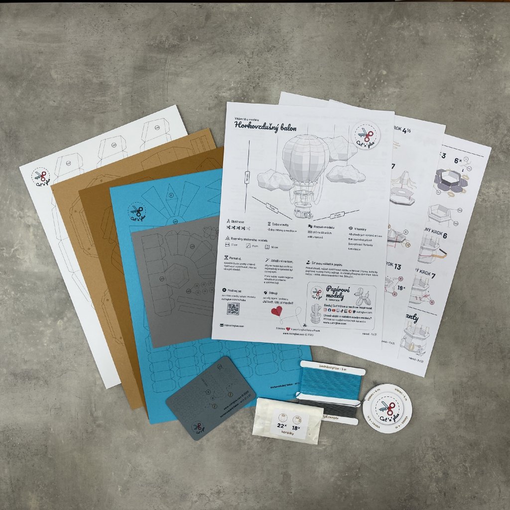 - 21 archů barevných kartonů s vytištěnými díly. Gramáž papíru je citlivě zvolena pro každý model a pohybuje se mezi 160–220 g/m².
