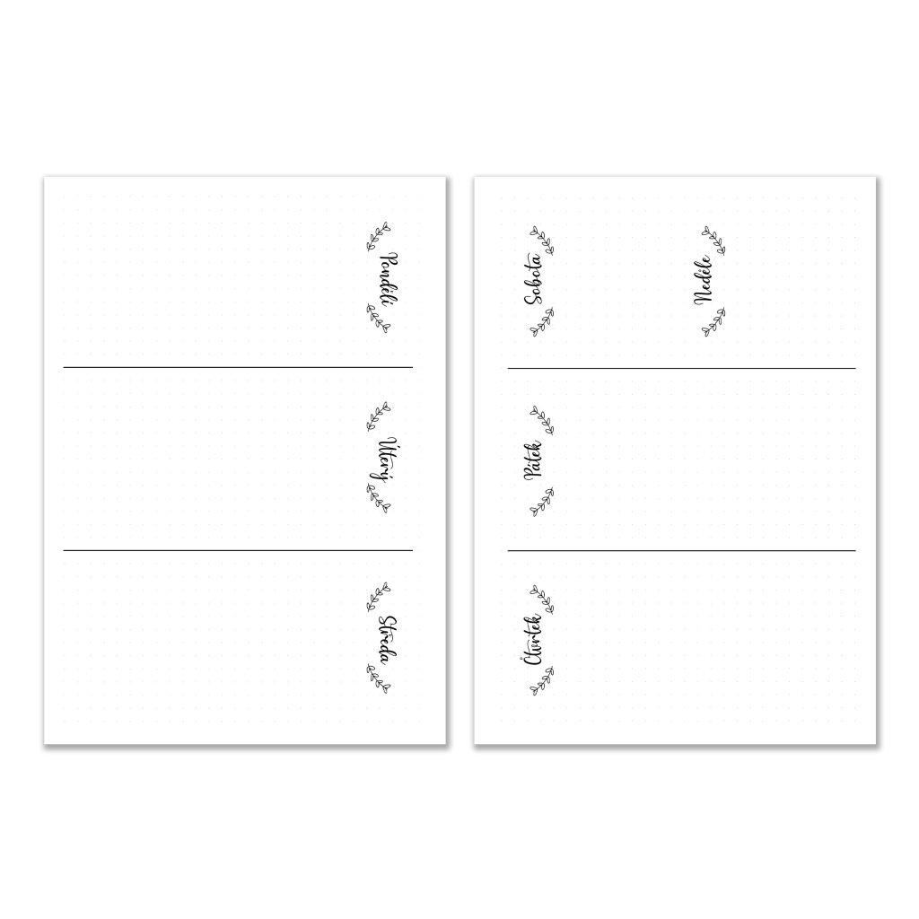 Tahle dvojstránka má skvělou výhodu v tom, že ti při psaní nepřekáží žádná vazba. Navíc můžeš složený diář postavit na stůl jako kalendář a mít týden stále na očích. Tak už se ti nestane, že na něco zapomeneš.