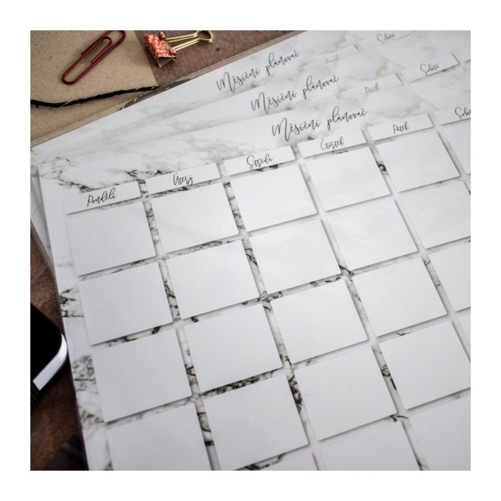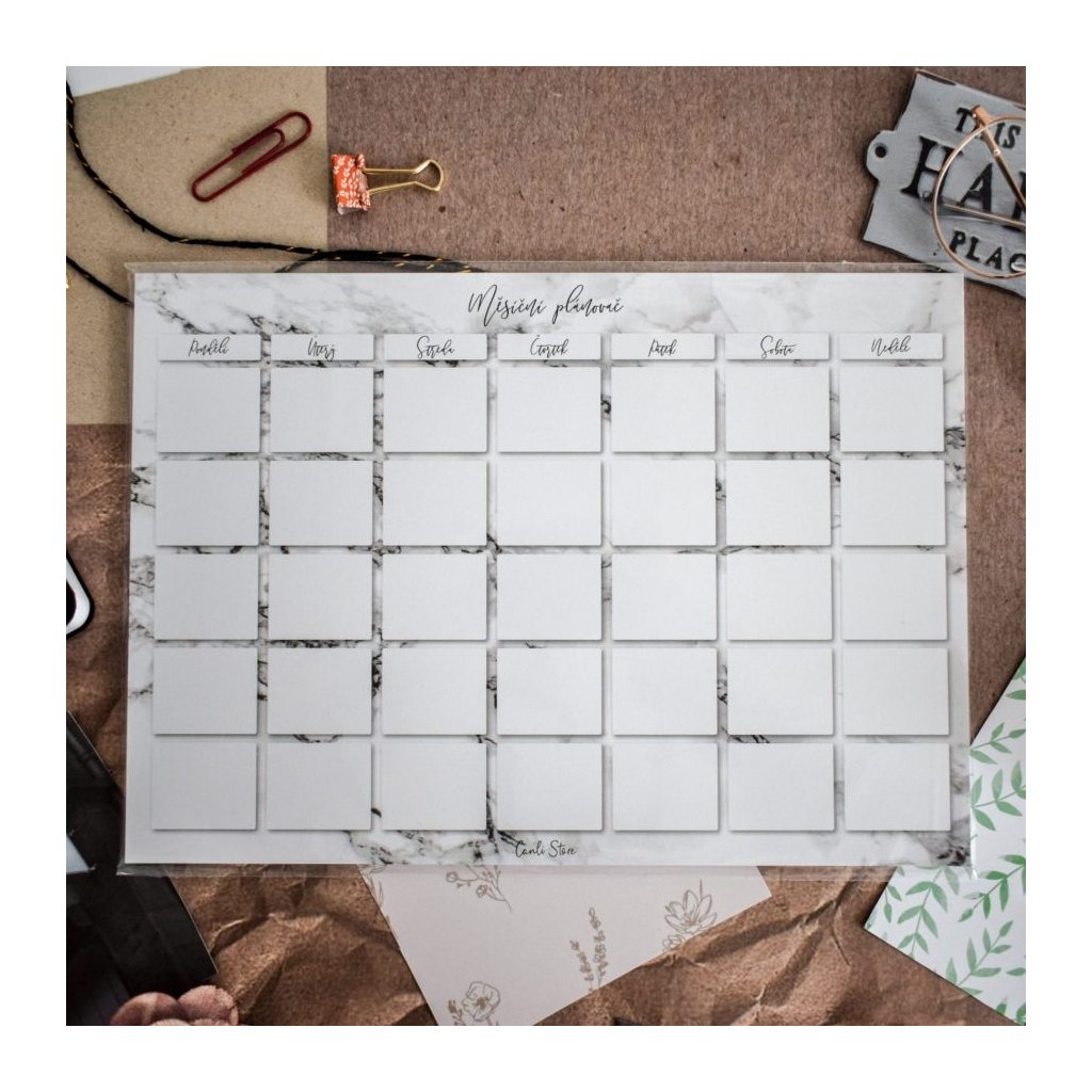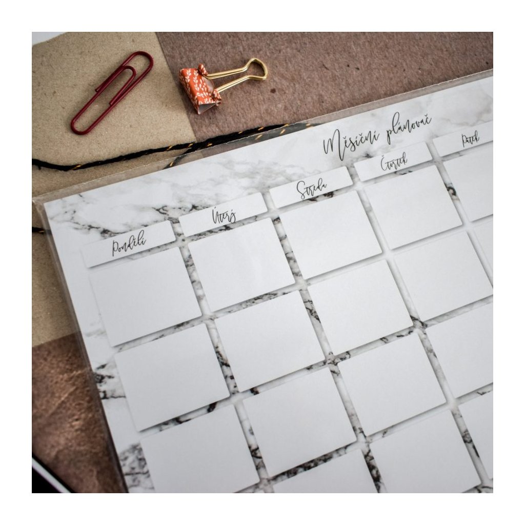 Pokud nejste zrovna fanoušci diářů, nepotřebujete plánovat úplně každý měsíc, nebo zkrátka potřebujete více přehlednou verzi, kterou budete mít stále na očích, je tu pro vás měsíční plánovač mramor. Funguje na stejném principu jako diář, jen je určen spíše pro domácnost nebo třeba na pracovní stůl.