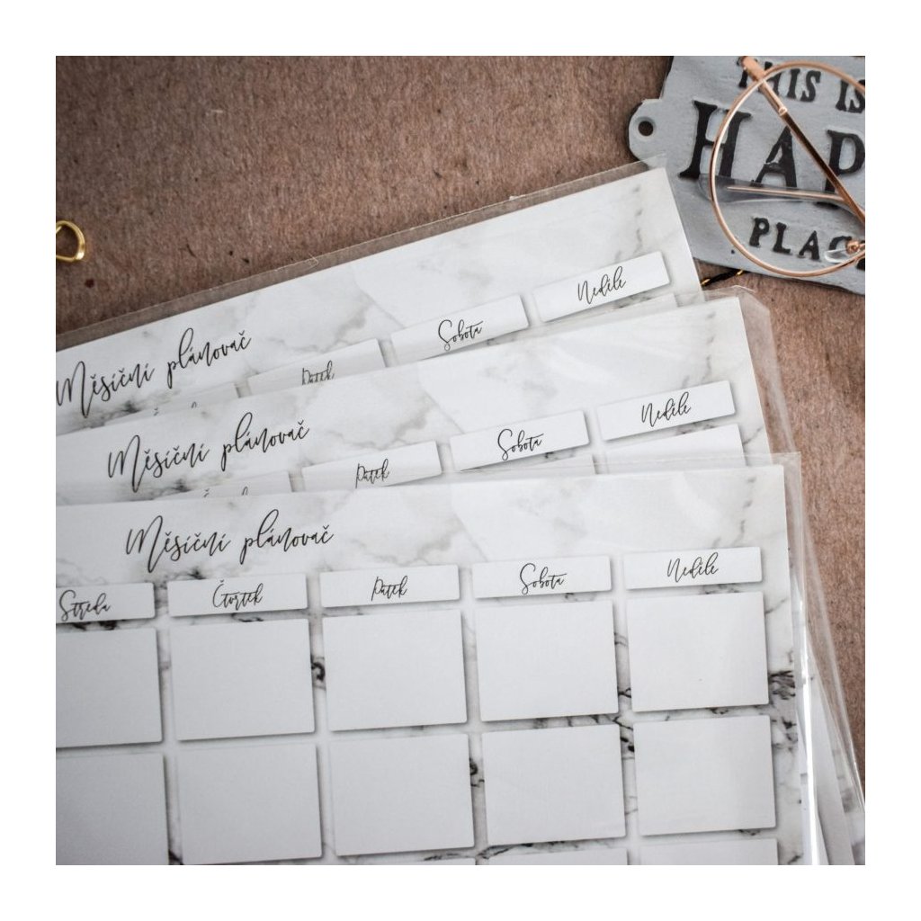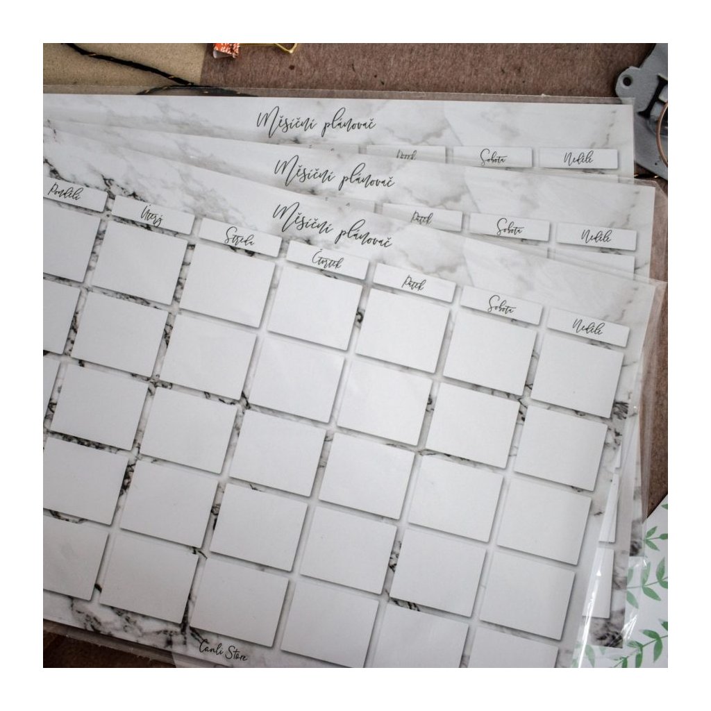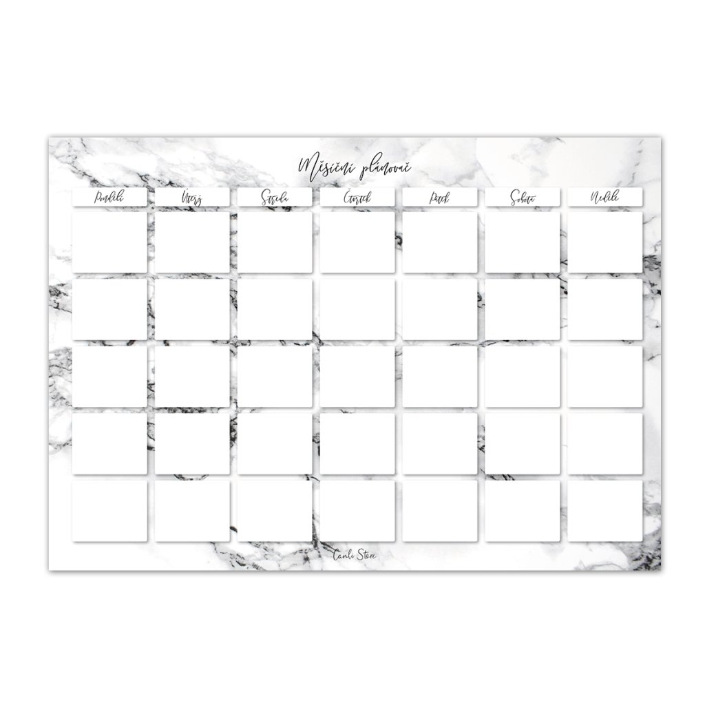 Pokud nejste zrovna fanoušci diářů, nepotřebujete plánovat úplně každý měsíc, nebo zkrátka potřebujete více přehlednou verzi, kterou budete mít stále na očích, je tu pro vás měsíční plánovač mramor. Funguje na stejném principu jako diář, jen je určen spíše pro domácnost nebo třeba na pracovní stůl.