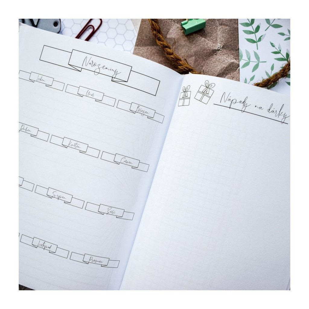 • Stránky: "Čeho chci v tomto roce dosáhnout", "Spoření", "Poznámky ke spoření", "Mapa", "Místa, kam chci vyrazit", "Narozeniny", "Co je v mé mysli", "Knížky", "Nápady na dárky", "Rok v pixelech", "To nejlepší z roku".