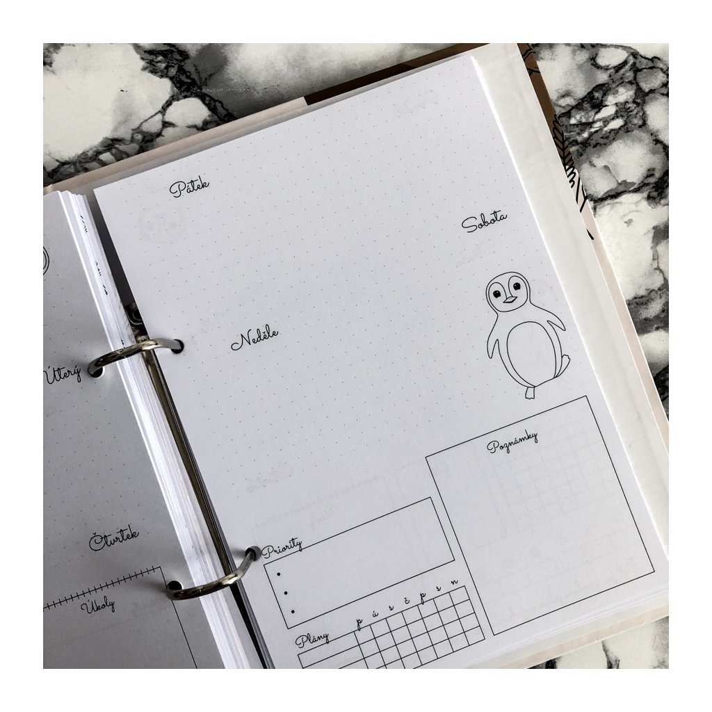 – Rozložení diáře ti pomůže mít lepší organizaci v životě, určíš si nejdůležitější cíle, priority a plány, kterých se chceš v daném týdnu držet. Díky tečkovaným stranám si také můžeš zvolit zda chceš čtverečky nebo linky (viz fotky) nebo psát jak budeš zrovna potřebovat.