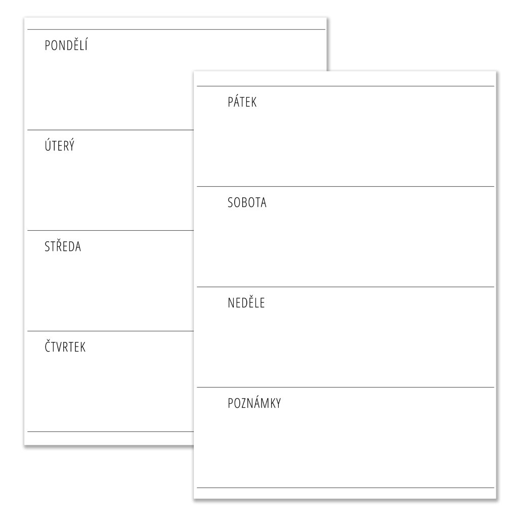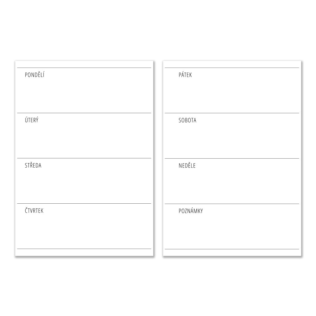 Jednoduchý týdenní přehled, díky kterému získáte okamžitý přehled nad svými aktivitami a událostmi. Nechybí ani místo na poznámky. Design je čistý s jednoduchým fontem, takže zde můžete naprosto rozvíjet své kreativní schopnosti. Dozdobte si dvojstránku zcela podle sebe.