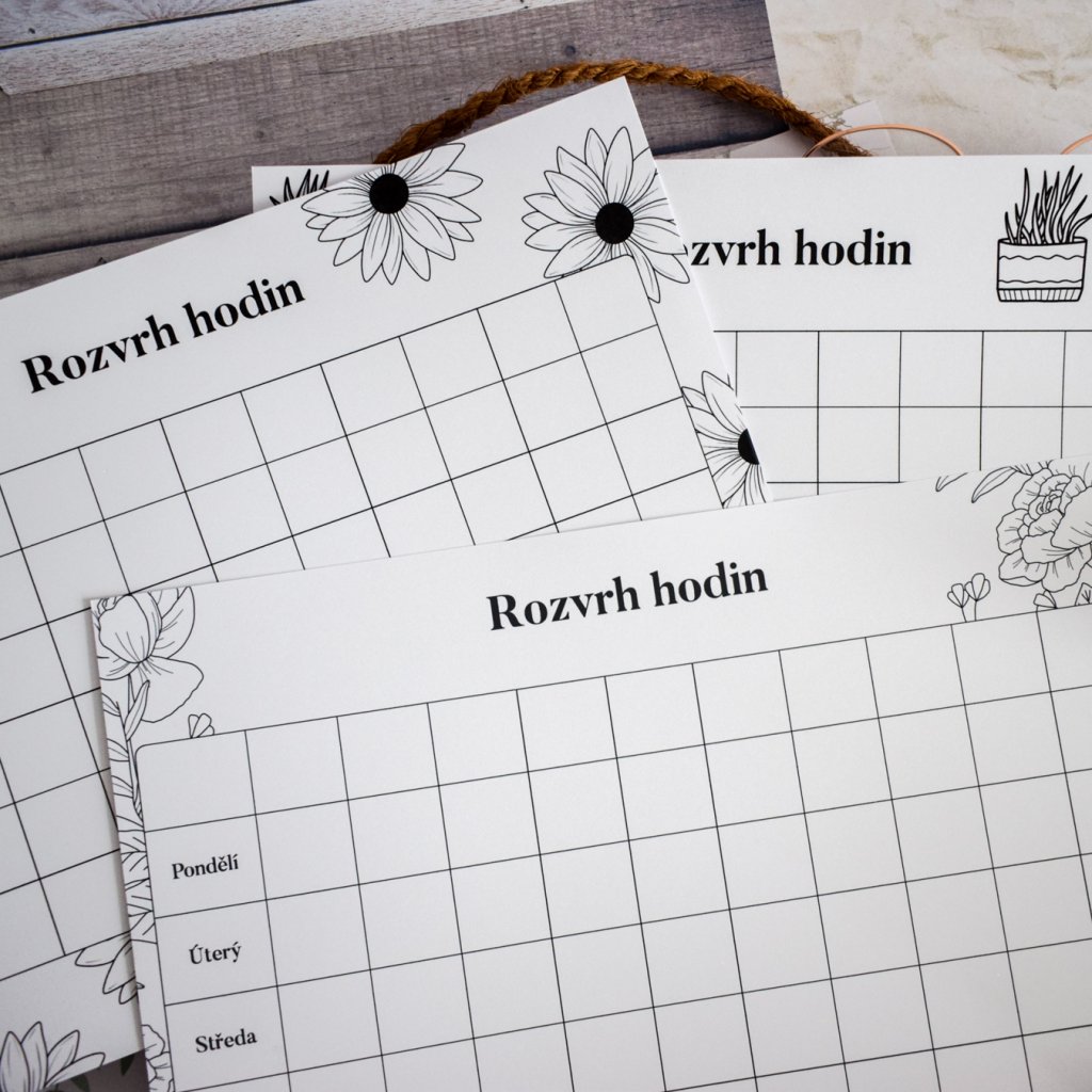 Kdo by ve škole nepotřeboval rozvrh hodin? Připravili jsme pro vás několik druhů školních rozvrhů hodin. Vyberte si z několika barevných designů. Černobílé designy si můžete vybarvit, když budete mít dlouho chvíli. Pro děti na základní škole to bude jistě zábavná činnost a naučí se, že je důležité mít přehled v tom, co je čeká. Nechte děti vyplnit rozvrh hodin dle svého. Spojovat zábavu s povinností to je to čeho se snažíme v Canli Store dosáhnout.
