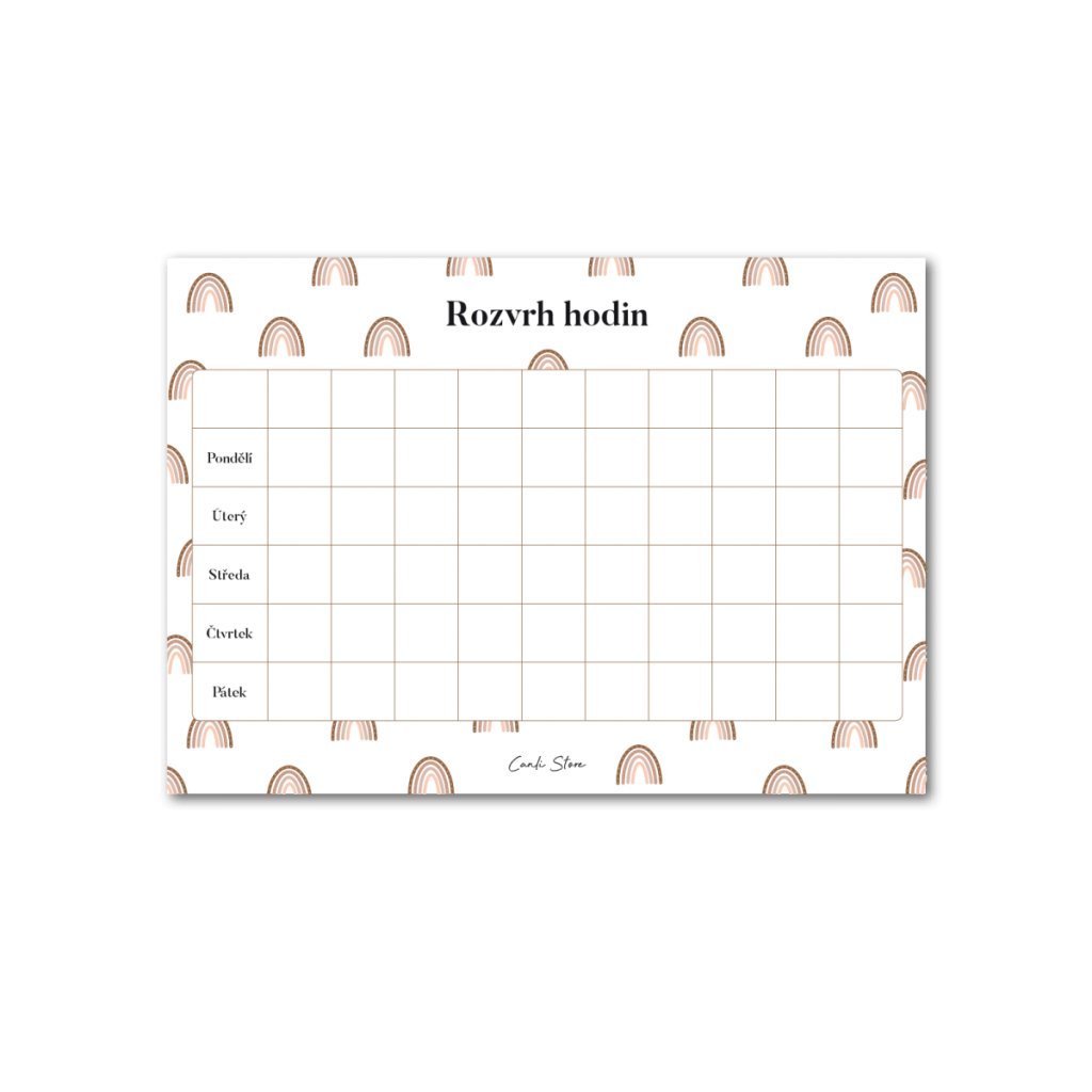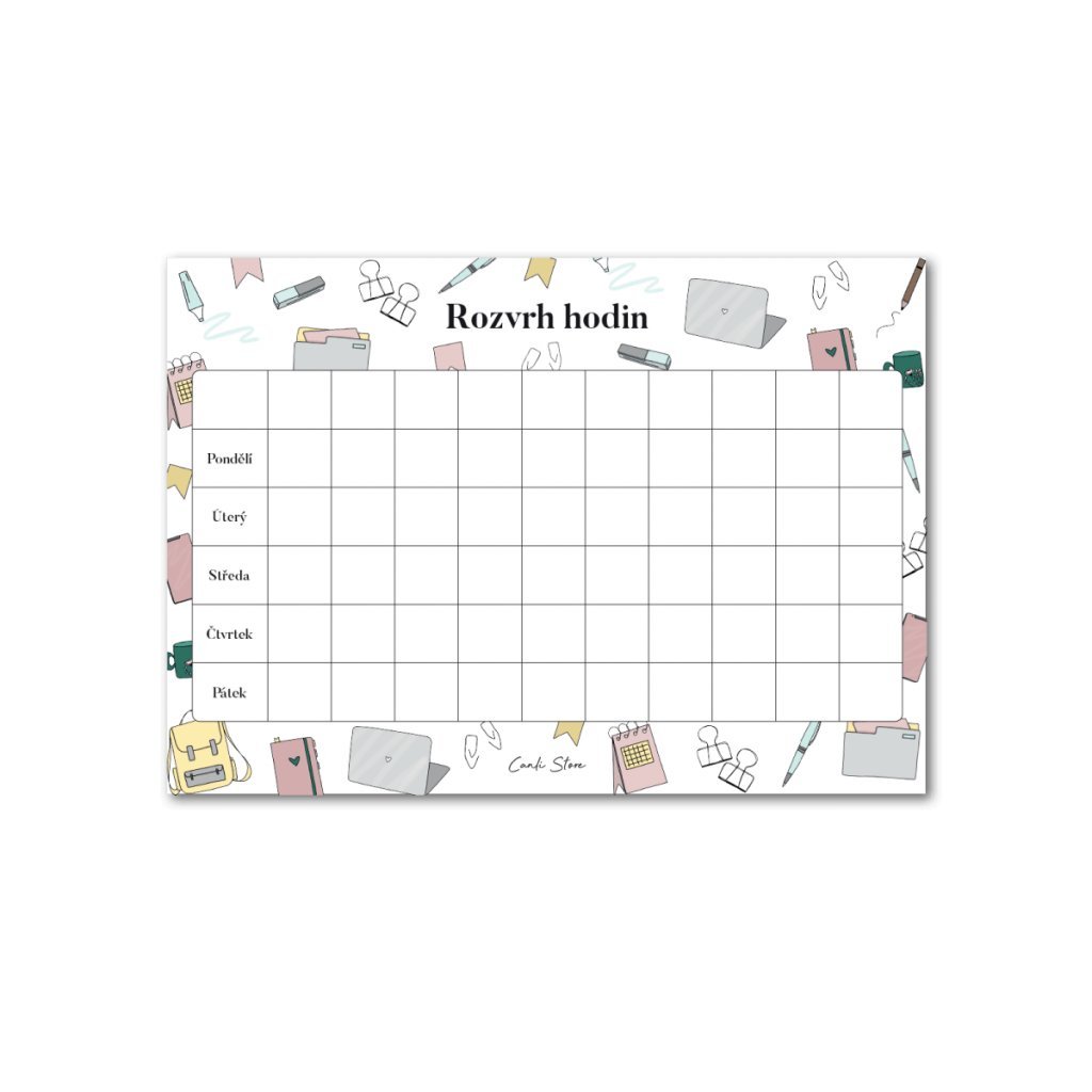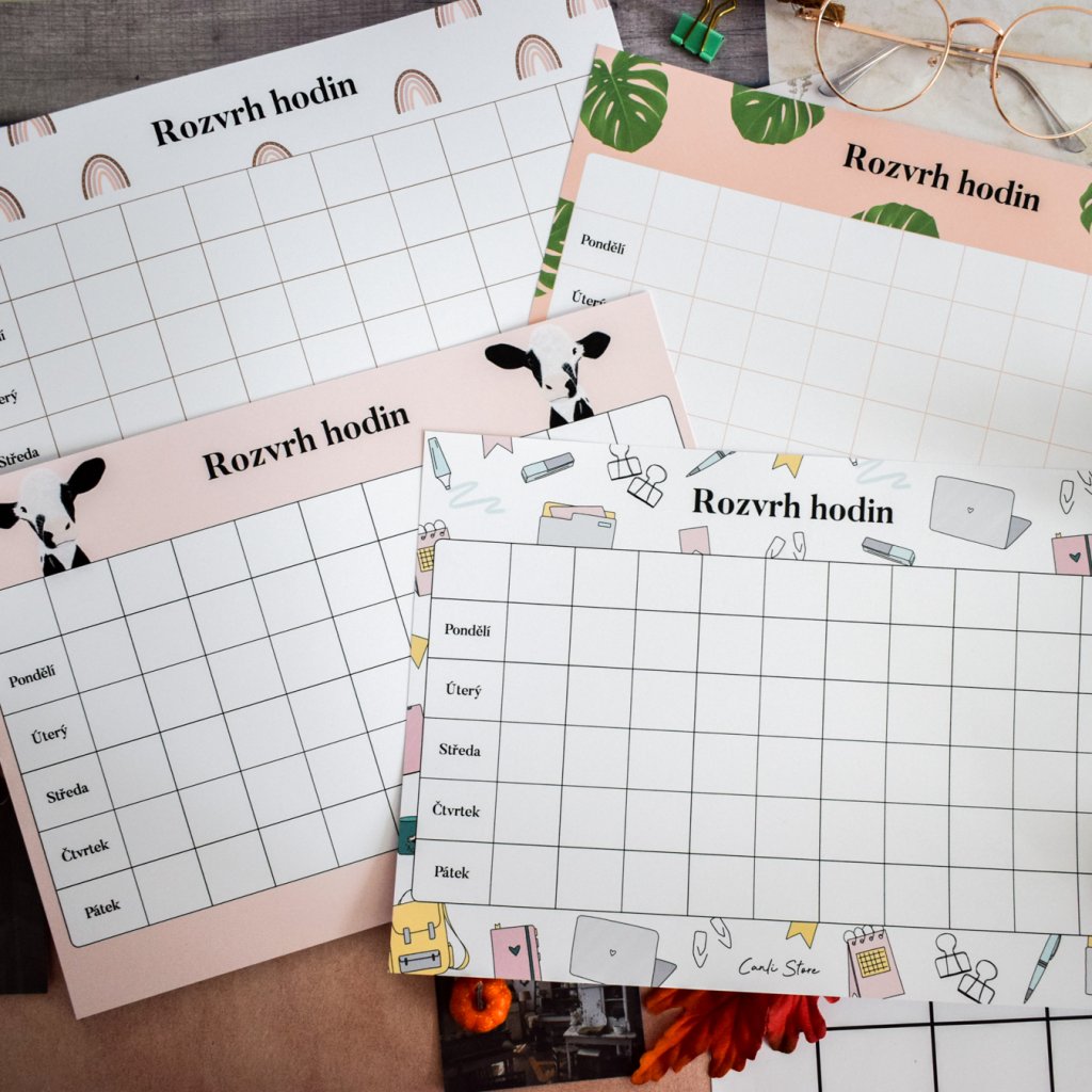 Kdo by ve škole nepotřeboval rozvrh hodin? Připravili jsme pro vás několik druhů školních rozvrhů hodin. Vyberte si z několika barevných designů. Černobílé designy si můžete vybarvit, když budete mít dlouho chvíli. Pro děti na základní škole to bude jistě zábavná činnost a naučí se, že je důležité mít přehled v tom, co je čeká. Nechte děti vyplnit rozvrh hodin dle svého. Spojovat zábavu s povinností to je to čeho se snažíme v Canli Store dosáhnout.