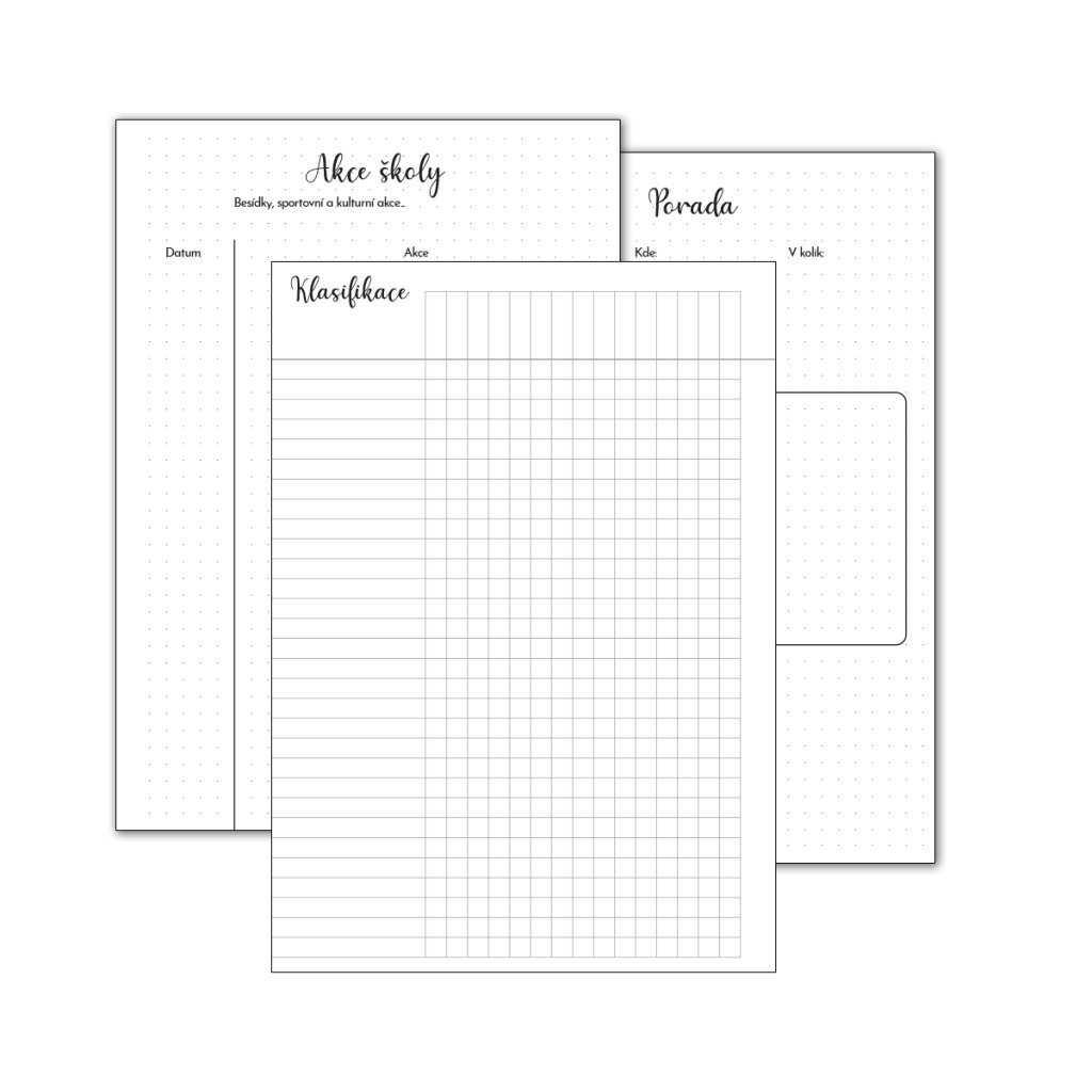- rozdělená na Jméno/ číslo v třídním výkazu/ Kontakt na rodiče/ Alergie a léky žáka/ Pochvaly, důtky - Klasifikace - 34 řádků na jména na jedné dvoustránce (68 stran - na druhé stránce je vždy možnost odstřižení části se jmény a tím propojíte přehledně jeden předmět na více stránek) - na rozdělení doporučujeme použít štítky, díky kterým se budete snadno orientovat v zápisníku