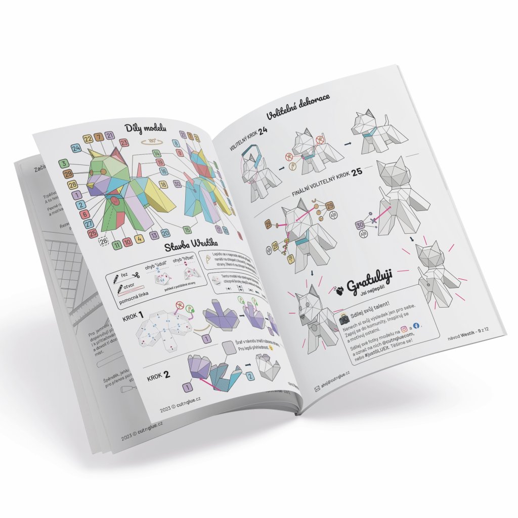 Gramáž papíru je citlivě zvolena pro každý model a pohybuje se mezi 160–220 g/m². - + aršík zlatého metalického papíru s vyřezanými díly laserem (3 různé známky/medaile na obojek).