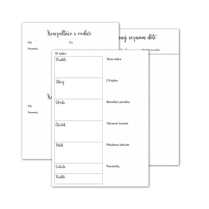 Následuje 10 tečkovaných stran pro vaše poznámky. Dále jsou 4 stránky na porady a 4 stránky na konzultace s rodiči, které jsou rozdělené na polovinu. Na zadních stranách pak naleznete roční kalendářní přehled od srpna do července. Strana akce školky a 2 strany s pravidelným týdenním rozvrhem.